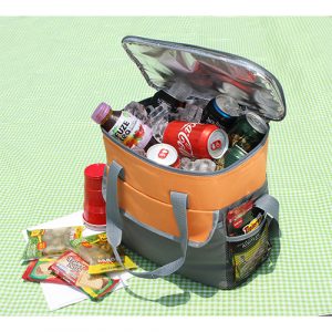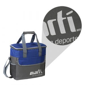 Fabricada en poliéster con forro de PVC y aluminio, con bolsas tipo red en costados. Disponible en colores azul, gris, negro, naranja y rojo.