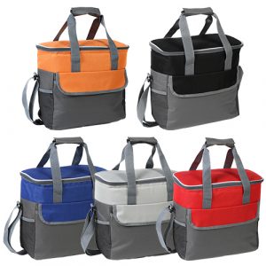 Fabricada en poliéster con forro de PVC y aluminio, con bolsas tipo red en costados. Disponible en colores azul, gris, negro, naranja y rojo.