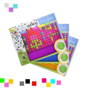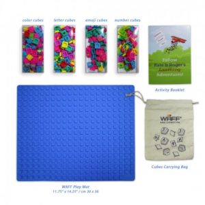 Incluye el WAFF Play Mat Blue 1 tapete de juego de silicona suave, 300 cubos WAFF surtidos (100 sólidos, 50 matemáticos, 50 letras y 100 emoji), 1 cuadernillo de actividades, 1 pequeña bolsa de algodón.