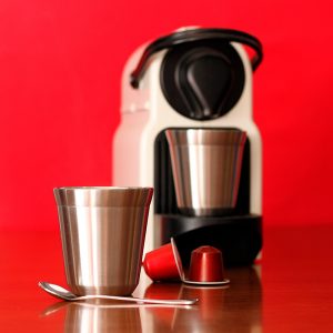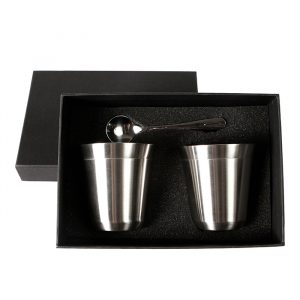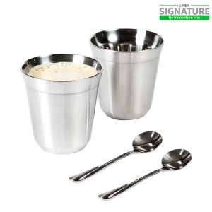Juego de 2 tazas de doble pared, fabricadas en acero inoxidable, incluye 2 cucharas y estuche, capacidad de 160 ml.
