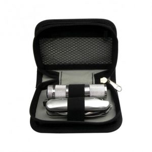 Set de 3 piezas, incluye: estuche con llavero arnés, navaja Multi-funcional y linterna.