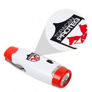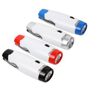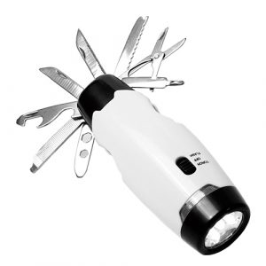 De plástico con luz led, luz flash, navaja de 8 funciones, estuche individual y baterías incluidas.