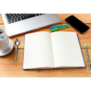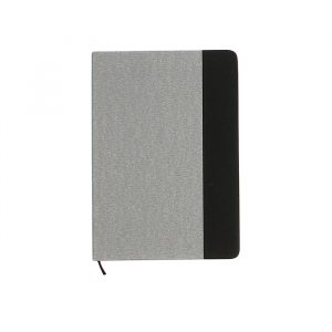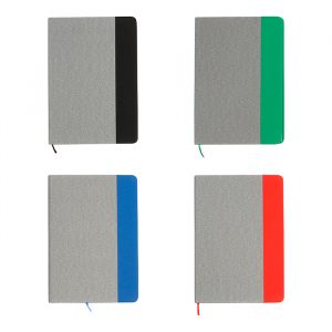 Libreta bi-tono fabricada en PU con listón separador de hojas y 80 hojas de raya tamaño a5.