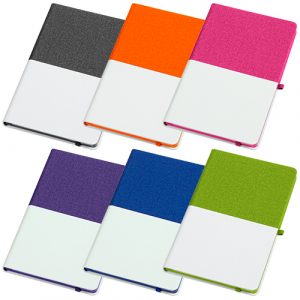 Con 80 hojas, fabricada en curpiel con tela. Disponible en colores azul, gris, morado, naranja, rosa y verde.