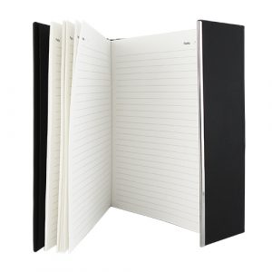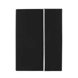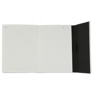 En color negro de curpiel, con 95 hojas de raya, apertura y cierre magnético.