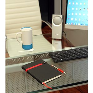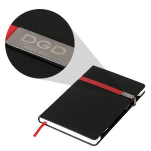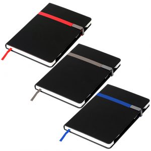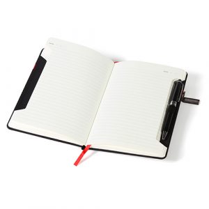 Incluye 118 hojas a raya, pasta rígida y cubierta curpiel. Con cierre magnético, porta bolígrafo y placa metálica. Disponible en colores azul, gris y rojo.