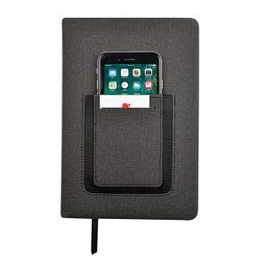 Libreta con compartimento al frente para celular y/o tarjetas, 80 hojas rayadas, práctica cinta divisora.