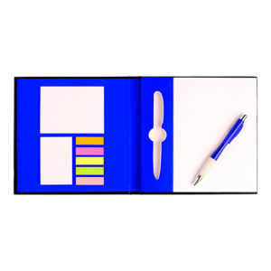 Libreta rígida de cartón negra con 100 hojas blancas y pluma tinta azul, notas adhesivas (50 blancas) y banderitas de colores (125 en 5 colores), interiores en color.