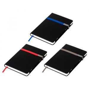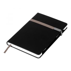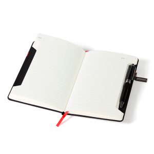 Libreta de pasta rígida y cubierta en curpiel, con 118 hojas de raya, cierre magnético, porta bolígrafo, separador de hojas y placa metálica. No incluye pluma.