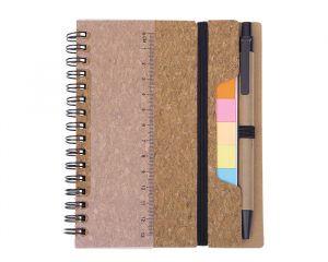Libreta ecológica de 60 hojas rayadas (120 páginas) con arillo metálico en color negro y cubierta de corcho. Incluye regla plástica, banderas adhesivas, bolígrafo de papel reciclado y banda elástica para sujetar.
