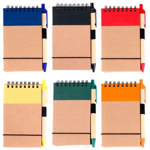 Con 50 hojas a raya y bolígrafo de tinta negra. Disponible en colores rojo, amarillo, naranja, azul, verde y negro.