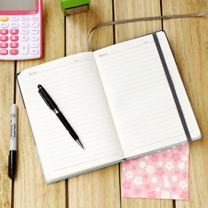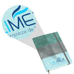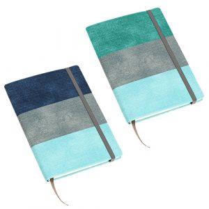 Con resorte sujetador de pastas y combinación de colores azul marino, gris, azul claro y verde, gris y azul claro.