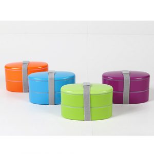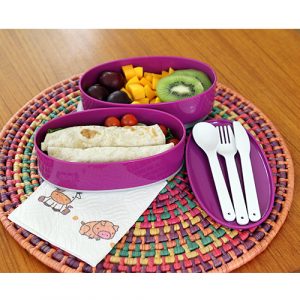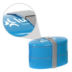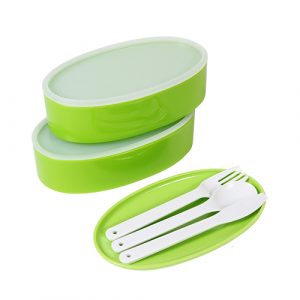 Con 2 compartimentos, banda sujetador de tapa y cubiertos (cuchara, tenedor y cuchillo).