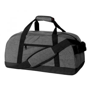 Maleta deportiva fabricada en poliéster color gris, con cierre al frente y correa de hombro regulable.
