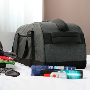 Maleta deportiva fabricada en poliéster color gris, con cierre al frente y correa de hombro regulable.