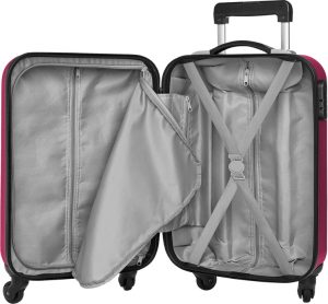 Sistema trolley. Manija de transporte reforzada. Mango con 2 posiciones, extensible hasta 54 cm. Interior: 2 compartimentos principales con cierre y elásticos ajustables. Polyester color gris. Placa metálica desmontable para grabado (medida: 6 x 4 cm.) Candado de combinación numérica.