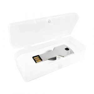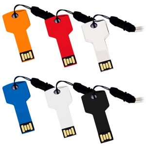 Capacidad 8GB, con estuche de plástico y colgante. Disponible en colores plata, negro, blanco, rojo, naranja y azul.