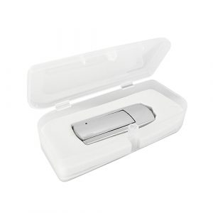 Capacidad de 8GB, con estuche de plástico y colgante.