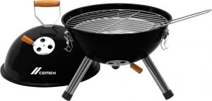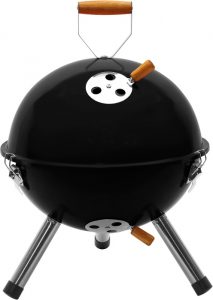 Cuerpo metálico y dos orificios de ventilación. Tiene un contenedor removible para el carbón, una parrilla de unos 29 cm de diámetro, la tapa cuenta con tres cierres de clip y asa de madera desmontable.