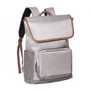 Mochila bi-tono, fabricada en poliéster con bolsa al frente y detalles en color café.