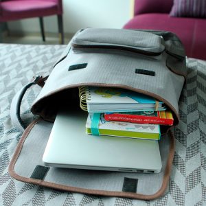 Mochila bi-tono, fabricada en poliéster con bolsa al frente y detalles en color café.