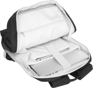 Fabricada en poliester. Capacidad 10 litros aprox. Dos compartimentos acolchados y forrados. En el exterior bolsillo frontal con apertura superior, bolsillo lateral y bolsillo inferior con cierres. El compartimento principal con espacio acolchado para notebook, otro para tablet y un amplio bolsillo con cierre, el segundo con bolsillo. Espaldar y correas acolchadas con red que permite la ventilación de la espalda. Correas ajustables. Cierres con tiradores en símil cuero.