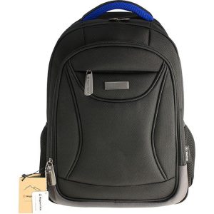 Fabricada en poliéster balístico de alta resistencia. Negra con detalles en color Rojo o Azul. Bolsas laterales con malla. Gran bolsa al frente con espacio para guardar tarjetas, bolígrafo, celular y llaves. Compartimento Principal con espacio para Lap Top. El grabado láser se coloca en una discreta placa metálica en la bolsa frontal. Tira cierres con marca presente. Asas de colgar acolchadas.