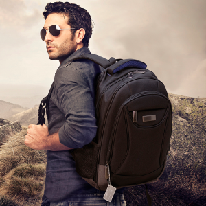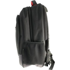 Fabricada en poliéster balístico de alta resistencia. Negra con detalles en color Rojo o Azul. Bolsas laterales con malla. Gran bolsa al frente con espacio para guardar tarjetas, bolígrafo, celular y llaves. Compartimento Principal con espacio para Lap Top. El grabado láser se coloca en una discreta placa metálica en la bolsa frontal. Tira cierres con marca presente. Asas de colgar acolchadas.