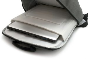 Un compartimento acojinado y forrado con espacio para guardar una notebook. Bolsillo horizontal en el frente con amplio espacio. Espaldar y correas acojinadas, con malla que permite la ventilación de la espalda. Cuenta con un bolsillo con cierre. Tira que permite enganchar la manija extensible de las valijas. El cierre del compartimento principal es invisible y cuenta con tirantes plásticos.