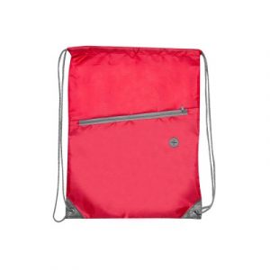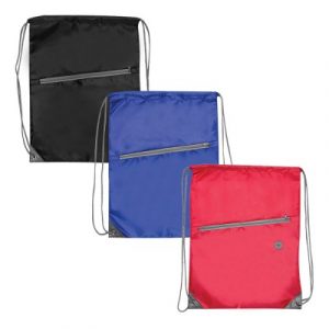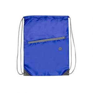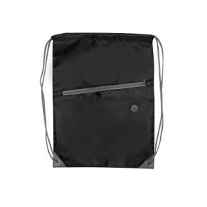 Morral de poliéster 210D con cordón, arillo reforzado, bolsa con cierre y salida para audífonos.