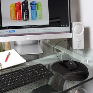 De plástico con cubierta de tela y descansa muñeca de silicón. Disponible en colores gris y negro.