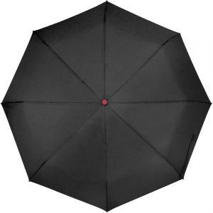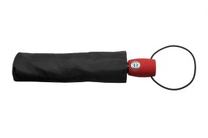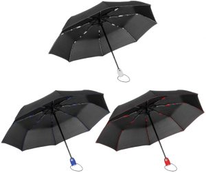 Paraguas automático con sistema antiviento. Eje metálico y varillas de fibra de vidrio de color. Mango de goma de color, contiene un botón que permite la apertura y cierre del paraguas. Sujetador elástico. Funda de poliéster con costura de color. Longitud del eje: 54.5 cm