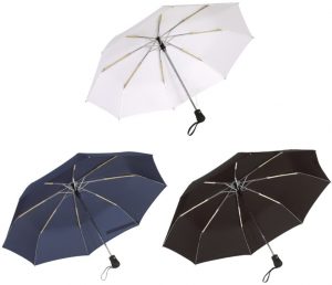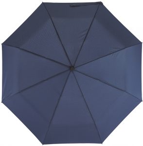 Botón automático de apertura y cerrado, 3 varillas metálicas, mango recubierto de goma, en poliéster-pongee con revestimiento especial hidrófugo, cierre con velcro.