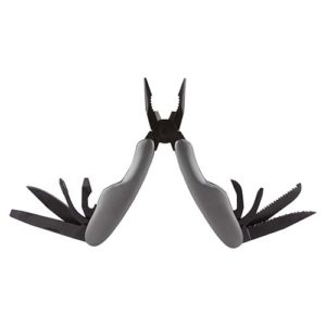 Pinzas (9 Funciones: lima para uñas, navaja, desarmador de cruz, destapador con desarmador plano, pinzas, navaja de hoja curva, desarmador plano, serrucho, navaja dentada. Incluye funda. )