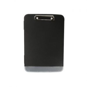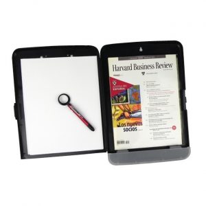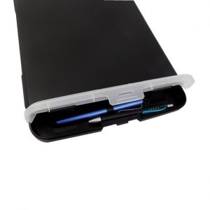 Clip frontal y compartimiento para bolígrafos, cierre lateral.