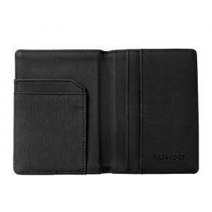 Porta pasaporte fabricado en curpiel con compartimentos interiores.
