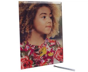 Porta retrato de vidrio para sublimar, La imagen queda adherida al vidrio por la parte posterior. Incluye postes de metal con tapón enroscable para detener el retrato por la parte inferior.