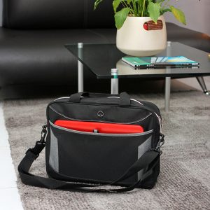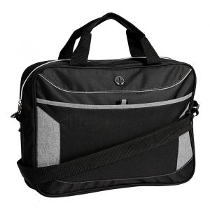 Portafolio ejecutivo fabricado en poliéster con salida para audífonos, bolsa al frente y correa de hombro.