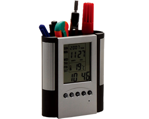 Portalápices con reloj, alarma, calendario, termómetro y cronómetro. Utiliza una pila de botón. Batería incluida.