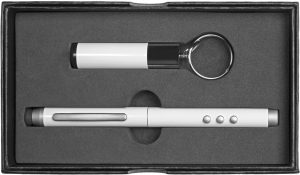 puntero laser para presentaciones con punta touch en la tapa. Transmisor USB para conexión remota. Funciona con tres pilas botón incluidas.