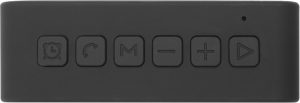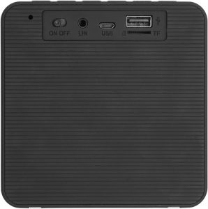 En la parte superior botonera de reloj que permite configurar la hora, botón para atender llamadas, botón de modo que permite seleccionar bluetooth, radio FM, tarjeta TF y entrada auxiliar, botón de volumen (+) y (-) y botón de play/pausa. Pantalla con luz led blanca que muestra la hora, modo seleccionado y estado de bateria. En la parte de atrás perilla on/off, entrada plug, 2 USB y TF. En la parte inferior dos gomas antideslizantes. Alcance 10 metros. Cuenta con manual para facilitar la configuración