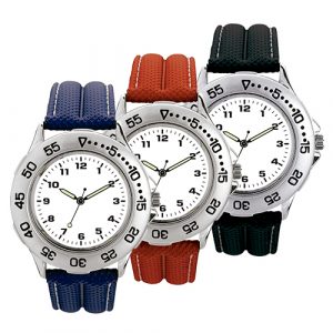Con caja metálica, arillo giratorio y correa de plástico. Maquinaria metálica japonesa de alta precisión. Disponible en colores rojo, negro y azul.