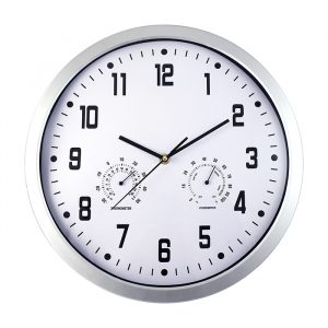 Reloj de pared con arillo de plástico y protección de cristal, con hidrómetro (mide la humedad en el aire) y termómetro (mide la temperatura). incluye caja de cartón individual y baterías.