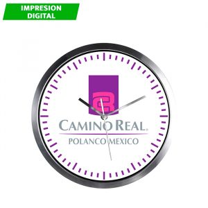 Reloj de pared con arillo metálico y protección de cristal. incluye caja de cartón individual y baterías.