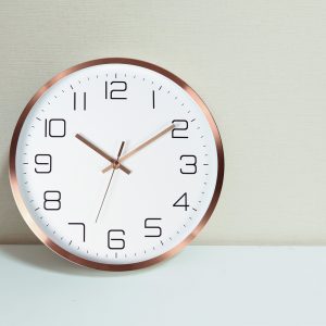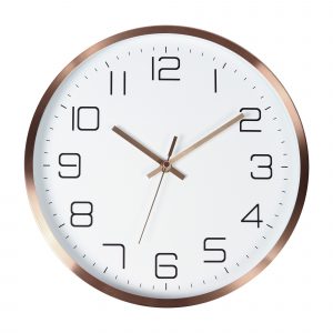 Reloj de pared 30 cm de diámetro, arillo de aluminio color dorado y protección de cristal, incluye caja de cartón individual.