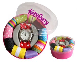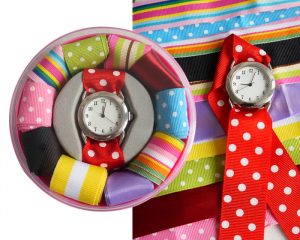 Reloj para Dama con 10 correas de poliéster intercambiables con colores y texturas variadas. Incluye estuche de plástico para regalo, en forma circular color rosa con tapa transparente.