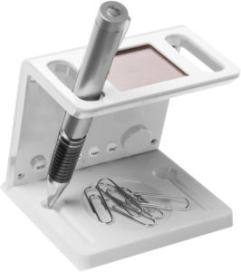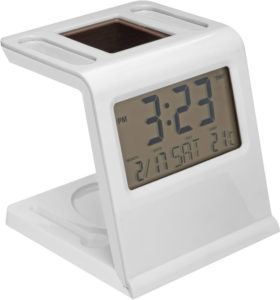 Reloj solar y porta lapicero. Reloj, alarma, temporizador, fecha, día y temperatura. Sin la luz solar cambia automáticamente y funciona con una batería botón. Dos compartimentos para bolígrafo y espacio imantado para guardar clips. Se convierte en tarjetero cuando se desmonta el reloj.