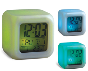 Alarma, calendario, termómetro, luz al presionar y 7 colores destellantes. Utiliza 4 baterias AAA (no incluidas). Pilas de botón incluidas.