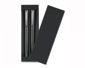 Set de bolígrafos metálicos de tinta negra: Un bolígrafo con tapa de punto fino tipo roller, y un bolígrafo con sistema giratorio. Incluye caja de regalo color, a juego con el set.