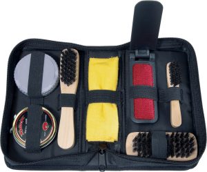 Set de 7 piezas: 3 cepillos de madera, 1 cepillo para ropa, lienzo, esponja y caja pequeña con cera incolora. Estuche con cierre.